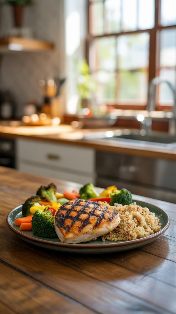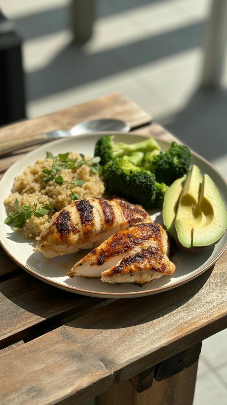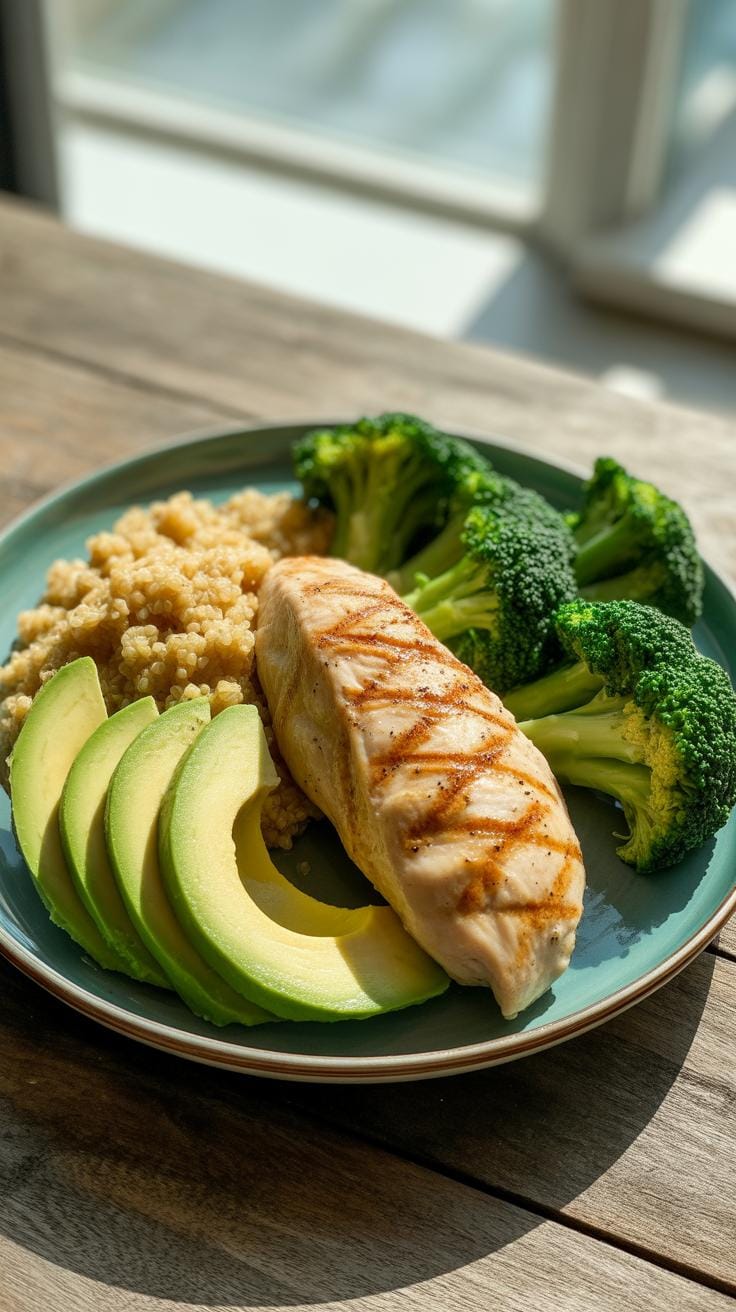- Grilled chicken breast, quinoa, and steamed broccoli at lunch