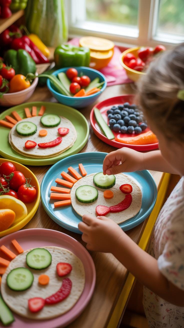 - Let them assemble their own food art, like a colorful fruit face or a sandwich with a smile.