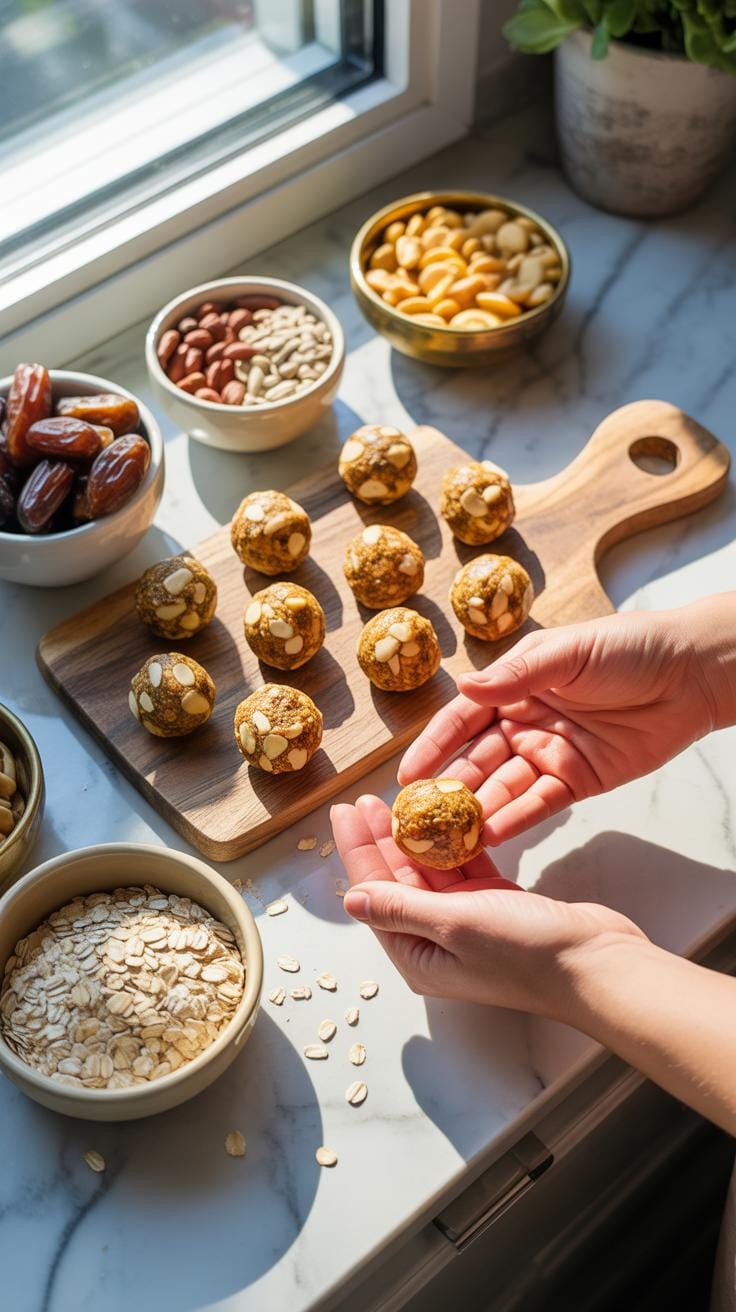 - Energy balls: Usually no-bake, sticky and chewy, rolled into small spheres. They often combine nut butter, oats, and protein powder.