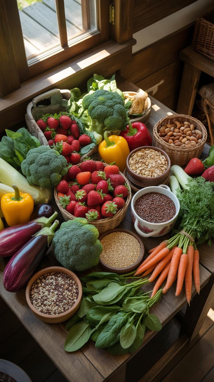 - Vegetables including carrots, spinach, sweet potatoes, and bell peppers